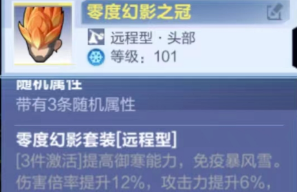 我的起源零度幻影之冠怎么样?零度幻影之冠的三件套效果是提高御寒能力,免疫暴风雪,伤害倍率提升12%,攻击力提升6%,闪避率提升8%,使用远程武器攻击为自身附加一层冷凝效果,暴击时再额外附加一层冷凝效果,暴击率