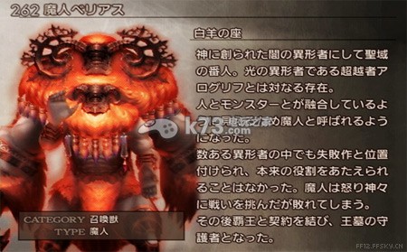 魔人ベリアス | Belias,the Gigas | 星座:白羊之座神所创造的暗之异形者—圣域之守门人(请联想如何进入古代都市),是和光之异形者—超越者阿洛格里夫相对应的存在。 因其人兽融合的外貌所以被称为魔人。 在众多的异形者中处于失败品的地位,所以没有被赋予应有的职位,魔人愤怒地向众神挑战,却失败了。 之后,魔人与霸