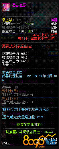 远古遗愿是dnf端游中65级的粉色武器光姐,在鬼剑士、黑暗武士角色职业等级达到65级以上就便可以进行使用,获取方式为:在65-71级普通地下城怪物爆落或者在加百利的神秘商店进行购买,下面就和我一起来看看这件装备的具体属性如何吧。 物理攻击力:669 魔法攻击力:648 独立攻击力:428 力量:73 该武器拥有极快的攻击速度,其面板属性虽然没有其他