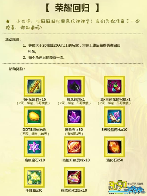 弹弹堂3最近有回归活动,老玩家可以回归了,那么到底这个回归有什么要求和条件呢?很多玩家不知道吧,就让我我来告诉你们吧。 弹弹堂3最新的荣耀归回活动,只要玩家等级大于20级而且离开的时间大于20天,就可以回归,而且能够得到很多奖励。所以玩家符合条件就回来吧。上面的文章就是弹弹堂3离开多久多少级可以回归 回归有什么条件?的内容了,文章的版权