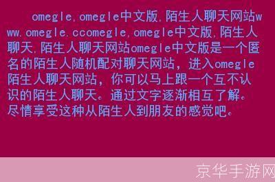 Omegle是一个广受欢迎的在线随机聊天平台,它允许用户与全世界的陌生人进行匿名聊天,由于语言障碍,许多非英语用户在使用Omegle时遇到了困难,为了解决这个问题,Omegle推出了中文版,让更多的用户能够享受到这个平台的乐趣。