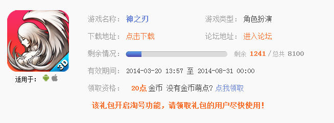 神之刃激活码怎么用?礼包激活码怎么填写?神之刃激活码礼包,神之刃礼包激活码领取咯,此次发放的是神之刃不删档测试新手礼包,大家有需要神之刃礼包激活码不删档测试新手礼包的赶紧点击下面的链接领取。神之刃礼包激活码领取地址:点击这里(神之刃不删档测试新手礼包)神之刃不删档测试新手礼包包含奖励:粉钻*180 光之龙马(蓝) 粉红可姆豆*2 金币50000 魔晶2500