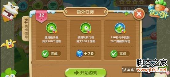 额外任务1、使用瓶子跑消灭100个怪物;2、使用玩具飞机消灭100个怪物;3、150秒内中找到20个隐藏的炮塔。保卫萝卜2第32关金萝卜攻略1、如下图,先放一个冰锥炮塔并升级,让它打周围的游泳圈道具。2、接着打小黄鸭,升级它爆出的道具,然后继续清理附近的道具。注意打道具属于业余时间,不能让怪物溜走。3、升级玩具飞机到顶级,怪物和附近的道具都会被打到。4、有金