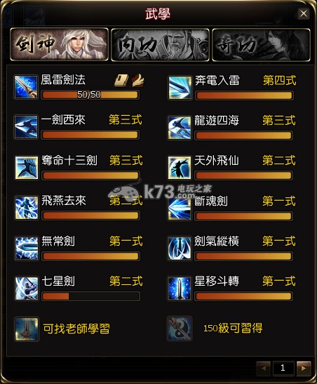 真古龙群侠传每个职业都有自己的技能,通过武学来获得自己的技能,下面以剑神为例给大家介绍职业技能加点方法。打开武学介面(K)后,即可阅览角色可学习和已学习的所有技能。1、武功等级:每个武功最高可提升至50级,满级时可提升到下一式。2、武功施放:将技能图示拖曳到快捷列上,要施放武功时只需点击快捷列相对应的按键即可。3、学习武功:学习武功须到白云城