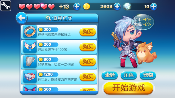 天天酷跑与众不同的是这是一款横版的跑酷类游戏。游戏的一开始有一小段剧情介绍,就像看漫画一样,不过剧情比较俗套啦,大概就是你的女神被坏人抓走了,你要去把她救回来,巴拉巴拉的。反正不停的往前奔跑就对了!我最喜欢的飞行喷气道具,如果金币足够多的话可以在游戏开始前自己购买一些道具使用。玩法非常简单,屏幕左右两边各有一个按键,左边的是滑地,