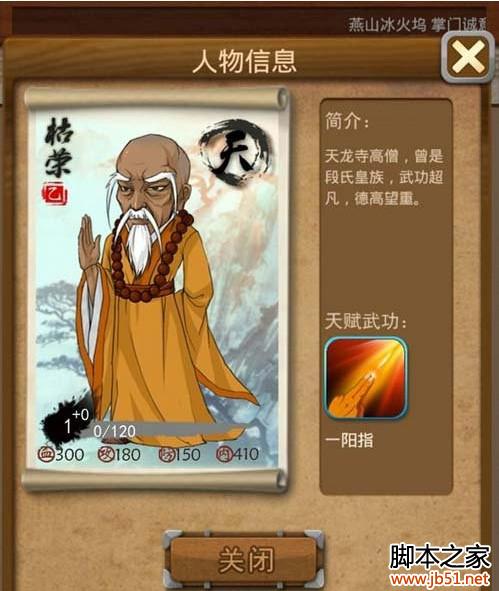 大掌门乙级弟子枯荣属性信息枯荣:天龙八部里的人物,大理皇室宗亲,年轻时在天龙寺出家为僧,武功高强,德高望重,掌有六脉神剑剑谱,在吐蕃番僧鸠摩智来夺六脉神剑剑谱,宁为玉碎不为瓦全将谱销毁,令鸠摩智徒然而去,但却被鸠摩智的火焰刀所伤。圆寂之前把他毕生功力“枯荣禅功”全部传给段誉。游戏内简介:天龙山高僧,曾是段氏皇族,武功超凡,德高