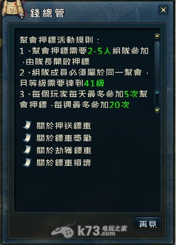 终于衝上41等以后,我一直很期待可以玩帮会押镖,马上就在可以接任务以后衝去临江口接任务。不少这样的武侠游戏,似乎一定都会有押镖任务,记得以前玩一个很古老的游戏,他的押镖就是短程的城内A点走到B点,另一个游戏笑傲则比较丰富,所以我也很好奇寻龙的押镖会有什么与众不同的地方@@▲押镖说明传送到临江口找钱总管,跟他说话他会押镖的规则跟奖励,还有一
