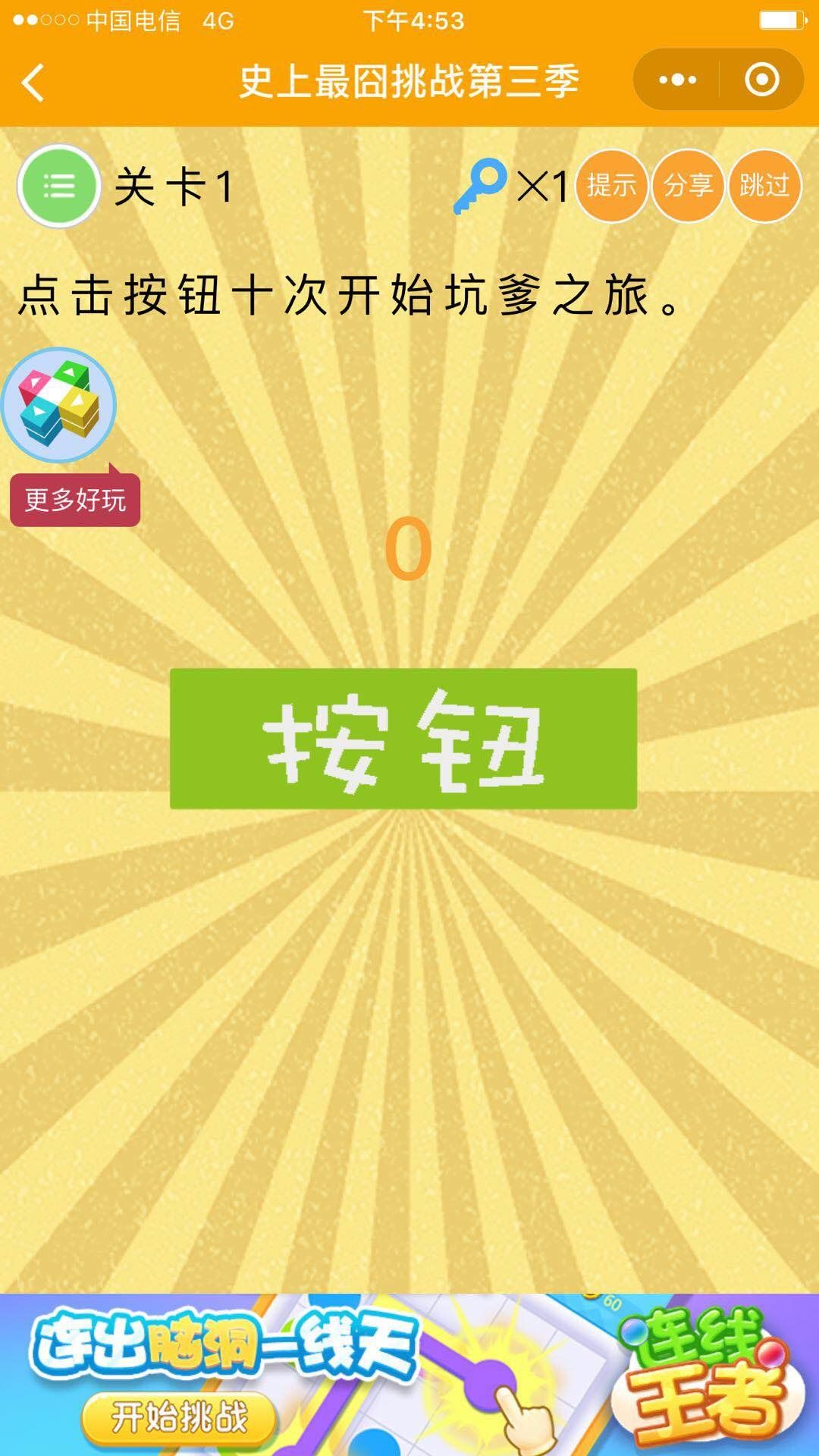 史上最囧挑战第三季出来啦,本次出来的关卡和之前的关卡比较的话,又多了许多新增元素,下面来和游戏鸟我一起闯关吧,不会的关卡我都给大家汇总出来了哦~让我们一起开动脑筋秀起来!史上最囧挑战第三季1-60关答案大全 第一关:点击按钮十次开始坑爹之旅正确答案:把按钮图标向下移动会出现真正的按钮,点击十次就可以通关了。第二关:老张开车过一个桥洞,但汽