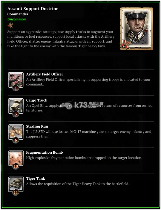 英雄连2阿登突击这款游戏很多玩家对于指挥官有很多不了解,我给玩家介绍的是英雄连2阿登突击全部指挥官介绍,希望能够帮助到玩家们。1.突击支援学说,传说中的烟斗男,最早是作为升级赠送的免费指挥官而存在的,多次被砍但仍然是主流。炮兵指挥官虽然不如掷弹兵的输出,但是有25弹药的金坷垃,能使周围步兵精度提升,还有有烟雾弹掩护进攻和撤退。欧宝部署可以