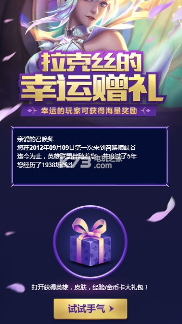 2017拉克丝的幸运赠礼活动网址是什么?lol拉克丝的幸运赠礼链接地址?官方地址很多玩家都不知道,也不知道如何领取奖励,下面来看看的攻略吧。如何参与:使用手机浏览器打开这个地址,然后登陆,并且选择大区就可以参与了。可以抽到什么?有机会抽到英雄、皮肤还有经验 金币礼包。这个活动没有活动规则,没有详细玩法,就是让你用QQ号登录上去之后点击领取,能领到东