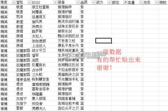 我叫MT全3D这款游戏中装备一般在哪里有掉落呢?不同的装备有什么属性呢?很多的玩家在问装备掉落图和装备数据表,下面就一起来看看我叫MT全3D装备掉落及数据表。我叫MT全3D游戏库,更多游戏攻略热门手游CF手游下载地址:K73.COM如上图所示,是装备的数据表。下图就是装备对应掉落的位置了,希望对大家有帮助! 灰塔上:将军、比死怪兽(掉落70武器碎片,装备制作