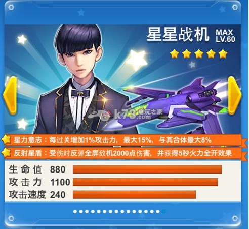 是腾讯旗下的人气手机射击游戏,而游戏也迎来的新的更新版本,而新的版本中会有新的剧情模式以及新的宠物碎片等新的系统内容等待着大家,最重要的是新的战机星星战机上场(我可以吐槽都教授吗)所谓一代版本一代神,星星战机以其强大的属性和技能再一次印证了这一句话。满级的星星战机拥有880生命值以及高达1100的攻击力,皆为所有战机中的最高属性。星星战机的