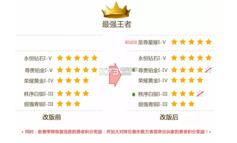 王者荣耀S8新赛季即将上线,玩家在S7赛季中的段位也将继承到S8中。那么每一分段的玩家会在新赛季S8中获得怎么样的定级呢?下面来看看王者荣耀S8段位继承规则吧。每个大段位下的小段位数量及星星数量变化:S8段位继承规则:老段位继承规则:上面即是王者荣耀S8段位继承规则的内容了,文章的版权归原作者所有,在此仅作网络免费经验分享,如有侵犯您的权利,请及时联