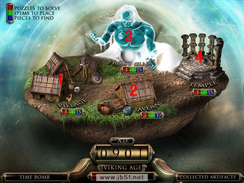 第一大关:VIKING AGE场景一 VILLAGE:先在下面图中找到所需要物品1、2、3、4的一部分,物品5找齐,然后在A处去另一个场景。(青色框内道具是在后面几个场景中找到再回来摆放的,a梯子在场景三找到放在a处,然后查看B处的旗子得到一页算术题,答案就是场景二需要的电话号码;b和c放在相应的位置。为了解说方便,后面都会把机关和道具放置处用青色框标出,即