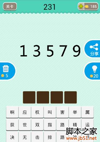 疯狂看图猜成语只写了游戏中只写了13579这几个数字,那么这个图片的打一成语出业正确答案是什么呢?下面给大家。图片如下所示:从图片上可以看出13579都是基数,没有偶数,所以就是找不到偶数,也就是双数啦,答案就非常好猜了吧。疯狂看图猜成语13579正确答案是:举世无双解释:全世界找不到第二个。出自:汉·东方朔答客难一首:“好学乐道之