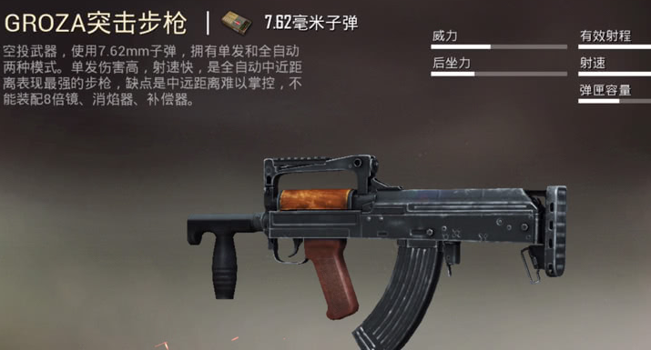 和平精英游戏GROZA该怎么玩呢?新手玩家见到空投补给的抢都会选择拿走,但是有感觉自己玩不好,我给大家整理了GROZA的玩法攻略,感兴趣的小伙伴就来看看吧。和平精英GROZA怎么玩一、枪械优点1、高爆发特种兵千呼万唤才始出来的GROZA来自于突击步枪家族,它使用的是7.62mm子弹,伤害较高,并且它没有枪托,整体枪身较短,再加上拥有较高的射击精准度,极其适合