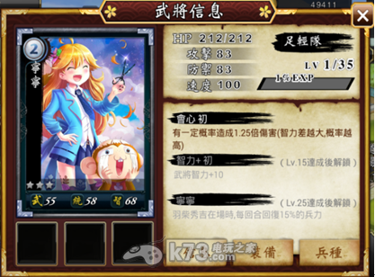战舞姬是一款以日本战国时代为故事背景的卡牌游戏,游戏中无论是兵种分类、装备名称或武将名字,都与一般常见的叁国游戏不太一样,不过其实这款游戏最最最吸引我的地方,就是所有的卡牌武将,都是超级正妹阿!(迷之声:真是太吸引人了!)每张武将卡牌打开,都会有一张美美的武将图案(点击图案可以将图放大),另外还会有一些武将的资料,像是叁围(是武、统、智,