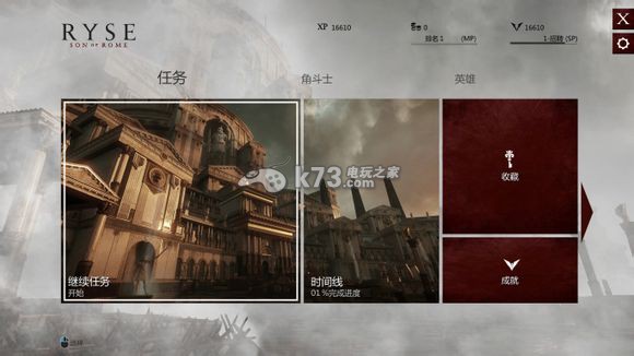 Ryse罗马之子相信大家一定都不陌生吧,没玩过这类游戏的玩家刚入手这款游戏肯定会有各种不习惯吧。我就为广大新手带来Ryse罗马之子全方位入门指南。 进入游戏主界面 可以看到界面做的非常简洁 就是一些方块而已嘛。。。但是给人一目明了的感觉 非常整洁干净时间线 就是单人战役的关卡选择 可以看到用罗马数字标明的章节 一共八章节 战役长度还算可以 第一章算是序幕