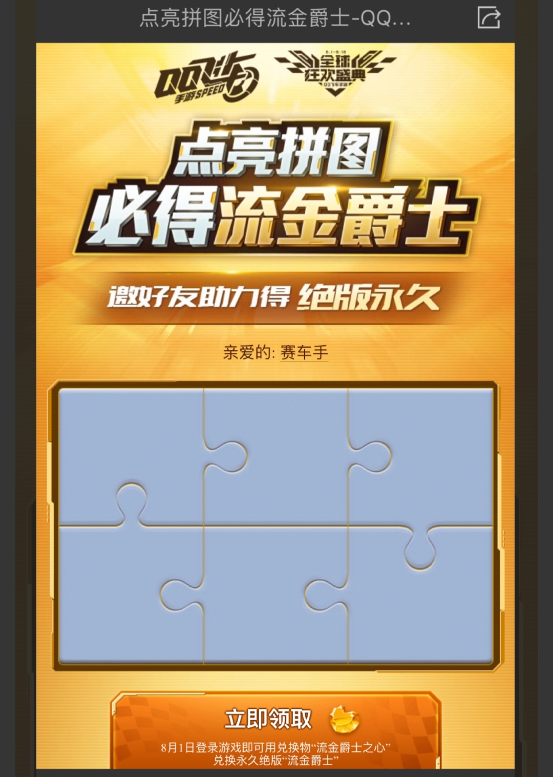 QQ飞车手游D车流金爵士怎么获得QQ飞车手游流金爵士登场,名字是不是很炫酷?它是QQ飞车手游中仅有的第二辆D车!一定要收藏!那怎么获得它呢?下面就由我给各位带来D车流金爵士获得方法吧。D车流金爵士获得方法活动时间:2019年7月18日-8月1日;活动期间,用户本人可点亮1块拼图,分享好友后,每位好友可帮助其点亮1块拼图,每人每日限助力3位不同好友,活动期间总