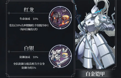 纳萨力克之王白金铠甲藏品怎么搭配?白金铠甲是遥遥领先的骑士角色,断档式的第一名,有突进斩击、魔动人偶、魔力吸收和世界断绝障壁四个技能,自我拉条,一人保全队的存在,大招可以给全队扛伤,肉是真的肉,坦度超