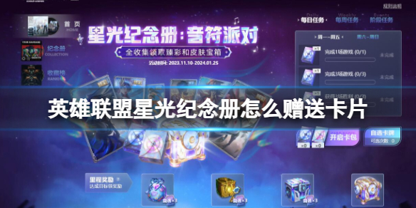 英雄联盟星光纪念册怎么赠送卡片?相信有很多小伙伴还不知道英雄联盟星光纪念册活动中卡片怎么赠送,下面我就给大家带来英雄联盟星光纪念册赠送卡片介绍。英雄联盟星光纪念册怎么赠送卡片1、首先玩家进入英雄联盟星光纪念册:音符派对活动,点击左上角的纪念册;2、然后选择需要赠送的卡牌,以永恩为例,选择心之钢永恩点击查看详情;3、接着在心之钢永恩页面点