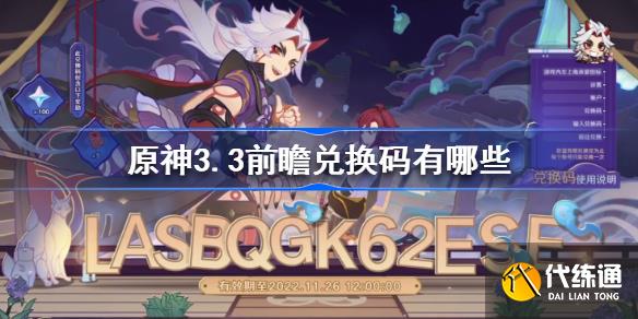 原神即将迎来3.3版本的更新,晚上8点正式开启3.3前瞻直播,这次播出的前瞻直播节目上官方同样分享了一批兑换码,原神3.3前瞻兑换码有哪些 兑换码(截止11月26日晚上12点前) 第一组兑换码:PTATRYJ62ESS 第二组兑换码:LASBQGK62ESE