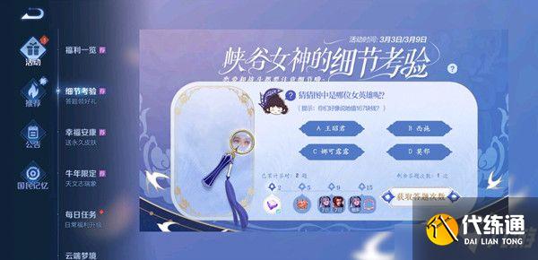 值167块钱的女英雄是谁?在王者荣耀的游戏中,近日开启了 峡谷女神的细节考验答题福利活动,很多玩家还不清楚正确的答案该怎么选择,接下来我就为小伙伴们带来王者荣耀值块钱的女英雄正确答案的解答吧值167块钱的女英雄是谁王者荣耀峡谷女神的细节考验第三题值167块钱的女英雄是谁?在王者荣耀最新活动峡谷女神的细节考验中,前几题都是根据图片和线索提示来猜英雄