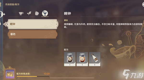 原神调酒配方有,晚钟,加入一份咖啡,一份红茶和一份牛奶,暮色,一份红茶和两份果汁,图书馆,三份咖啡,金色伊甸,两份咖啡加一份牛奶,星璇之夜,一份咖啡加两份牛奶。相关推荐:前瞻直播观看指南原神调酒配方大全调酒是限定活动曲生酌微梦中的一项有趣玩法,完成调酒任务后可以获得原石和名片等奖励。鸡尾酒有晚钟和暮色,晚钟需要加入一份咖啡,一份红