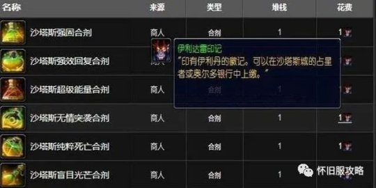 魔兽怀旧服自从上线P3阶段后游戏里药剂合剂的价格就以肉眼可见的速度在下降,原因则是T6副本小怪会产出一种可以兑换各类合剂的物品:伊利达雷印记!因为是副本小怪掉落,所以这玩意掉率极高也极易获得,甚至在后续SW的小怪也会掉落,所以现在玩家在购买炼金制作的合剂或材料时成本相比之前会大大降低。换合剂需三本声望崇拜在沙塔斯城银行找到NPC哈杜尔即可使用伊