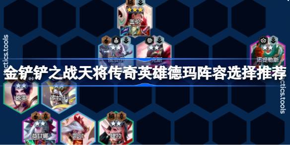 金铲铲之战是一款自走棋类型的对战竞技手游,在游戏里面当前版本推出了新的职业和特质可以让玩家去挑选组合,那么最近的天将传奇英雄德玛阵容怎么搭配呢,下面就让我们来看看金铲铲之战天将传奇英雄德玛阵容选择推荐。金铲铲之战天将传奇英雄德玛阵容选择推荐 1.阵容推荐 ?天将传奇英雄德玛(豪华版)? &em