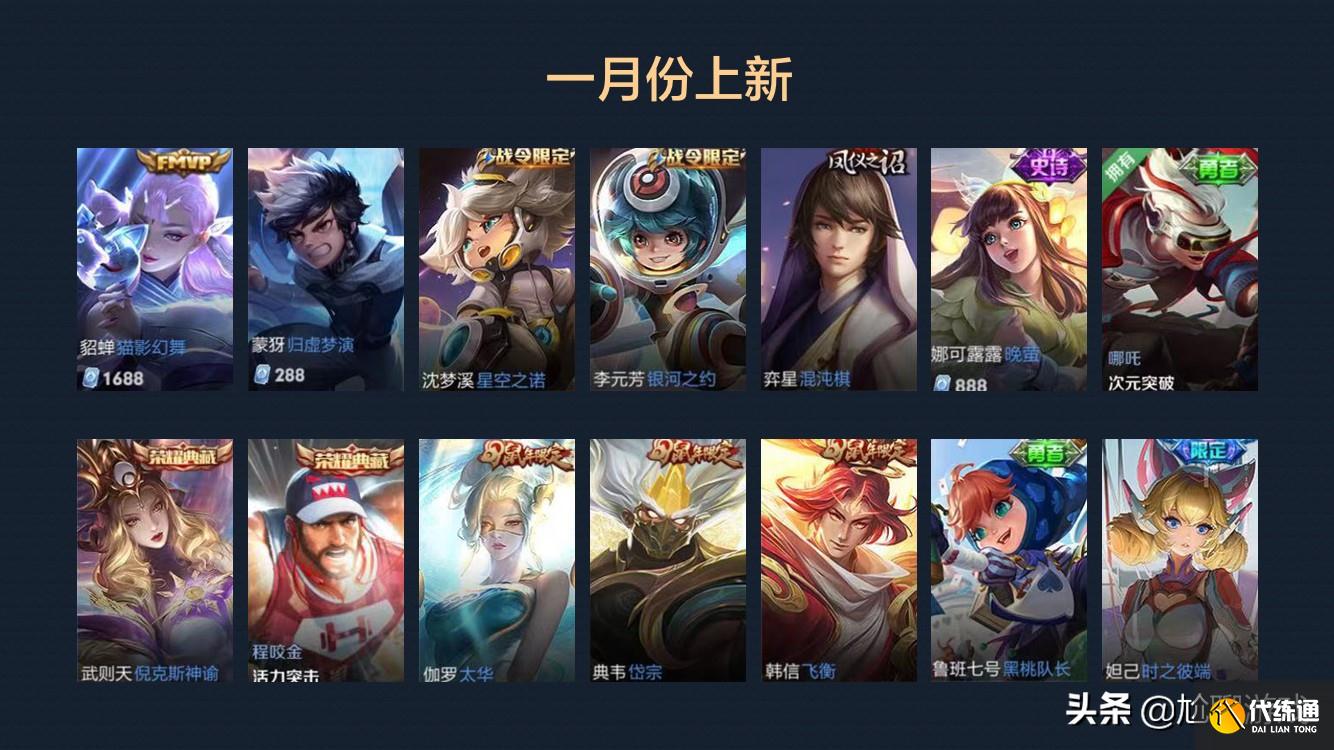 2020一整年,王者荣耀正式服共上架英雄皮肤79款,包括新皮52款,以及返场限定27款。此文特对79款皮肤的上架 返场时间以及售价做一次详细的汇总,以作查阅留念。52款新皮(按照皮肤上架时间进行排序)一月1.貂蝉-猫影幻舞(FMVP限定)上线时间:2020 01 01,1688点券;2.蒙犽-归墟梦演上线时间:2020 01 09,288点券;3.沈梦溪-星