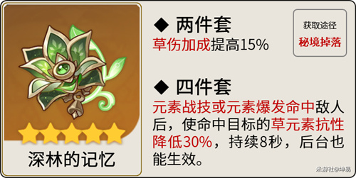 原神纳西妲最近也是复刻了,其中作为高强度的角色抽取的玩家也是非常的多的,最近也是有不少的玩家问我小草神到底带哪些圣遗物比较合适,关于这个问题我也是在下面给出了详细的解答,各位玩家快来了解一下吧。 原神纳西妲带什么圣遗物比较好 最佳推荐:深林的记忆四件 纳西妲最适合还是草套-深林的记忆,四件套效