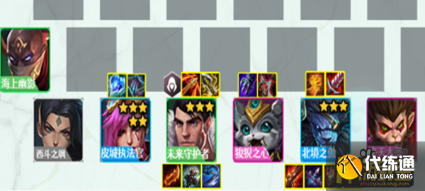 一、阵容分析 1.阵容 未来守护者(杰斯)、狻猊之心(纳尔)、北境之傲(狮子狗)、齐天大圣(猴子)、皮城执法官(蔚)、西斗之飒(豹女)、海上幽影(派克) 4狂野(全员加攻速)3换形(换形变身加血)3潜行者(潜行者加爆伤暴击率)2斗士(斗士加血)2海克斯(开局减少对方攻速