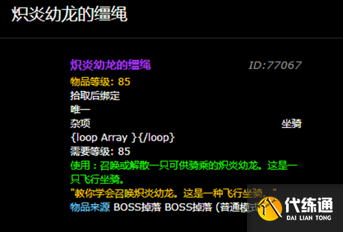 炽炎幼龙的缰绳是解锁炽炎幼龙的物品,所以不少玩家都想要拥有它,但是许多玩家不知道魔兽世界炽炎幼龙的缰绳怎么获得?我就为小伙伴们带来魔兽世界炽炎幼龙的缰绳获取方法,希望可以帮到大家。魔兽世界炽炎幼龙的缰绳获取方法 炽炎幼龙的缰绳在团队副本巨龙之魂中疯狂的死亡之翼掉落,掉率1%左右,官网显示掉率为非常低。 上面是魔兽世界炽炎幼龙的缰