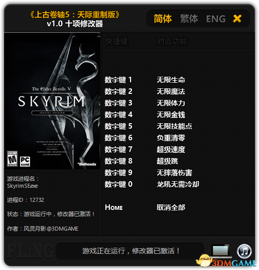 上古卷轴5天际重制版十项修改器使用方法一、下载链接:https: dl.3dmgame.com 201610 84096.html?1477902330对应游戏版本:v1.0 如无意外全部或部分功能也会支持其他后续版本二、基本功能:点击简体、繁体、English,可以切换语言 (切换语言后修改器将把该语言设置为默认语言)点击音乐图标,可以开启 关闭音乐,游