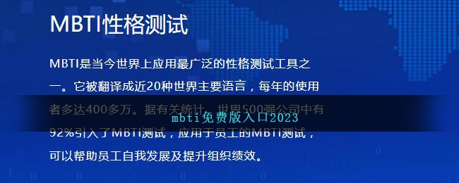 MBTI性格测试是由美国的凯恩琳·布里格斯和她的女儿制定的。该指标以瑞士心理学家荣格划分的8种类型为基础,加以扩展,形成四个维度,这四个维度就是四把标尺,每个人的性格都会落在标尺的某个点上,这个点靠近哪个端点,就意味着这个人有哪方面的偏好。给大家带来了mbti免费版入口2023,mbti官网入口链接分享!i人格和e人格测试官网入口链接官网入口为:https: