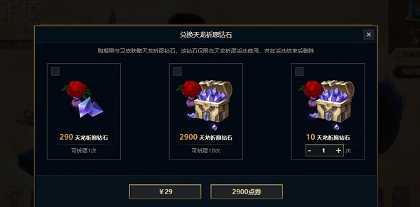 英雄联盟天龙祈愿抽奖活动已经正式开启,大家通过参与活动可以抽到皮肤奖励,皮肤的获取也是要看概率的,那么想要通过天龙祈愿抽到皮肤需要花费多少钱?具体的价格我这就分享在下方攻略中,有兴趣了解的玩家可以多来了解一下哦。英雄联盟天龙祈愿皮肤抽奖价格介绍首次6元必得未拥有皮肤,之后是29元 次祈愿,祈愿是有98.5%概率获取未解锁皮肤,1.5%概率获取福袋,福