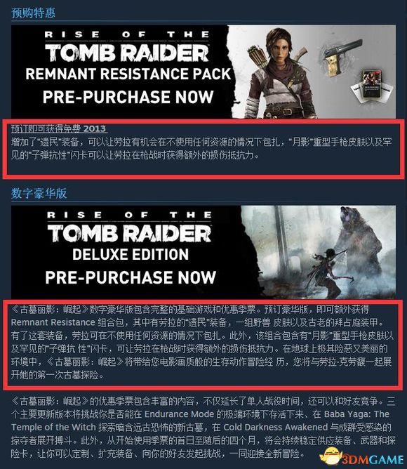 古墓丽影:崛起 游戏购买注意事项及配置要求一览为小伙伴们带来的是古墓丽影:崛起游戏购买注意事项及配置要求一览!1.Standard Edition 和 Digital Deluxe Edition的区别Standard Edition即标准版、游戏本体。Digital Deluxe Edition即数字豪华版,含游戏本体+季票(Season Pass)。季票