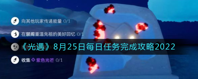 光遇2022年8月25日每日任务怎么完成?在光遇这款游戏中每天都有每日任务,而且每天的每日任务都是不一样的,每天的每日任务都会刷新,让玩家感觉到很难受,每日任务主要是有4阁,有很多小伙伴还不知道今天2022年8月25日的