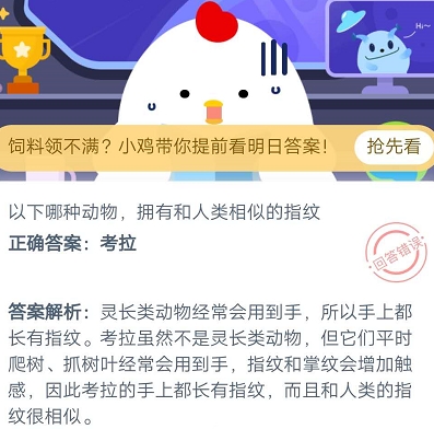 支付宝蚂蚁庄园小课堂7月20日每日一题答案是什么?支付宝蚂蚁庄园小课堂每天的凌晨更新一道题目,答对后能领取小鸡饲料,的问题是“以下哪种动物拥有和人类相似的指纹?”不知道答案的朋友不妨随三大妈我一起来看看吧。 庄园小课堂往期答案汇总以下哪种动物拥有和人类相似的指纹? 猫猫考拉正确答案:考拉 答案解析:灵长类动物经常会用到手,所以手上都长有指纹。