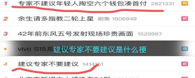 建议专家不要建议这个梗出自于近期的一则访谈节目多财多议,专家给到的建议当中提到的三个比较具有代表性的内容,不建议男女结婚时掏空六个钱包,还提到买房还月供,买房更划算,将这些观点整合起来,大多数都是自相矛盾的,网友们对于专家的建议并不买账,并且希望其不要乱建议,每个人都需要为自己说的话负责的,所以被大家吐槽。 建议专家不要建议是什么梗1