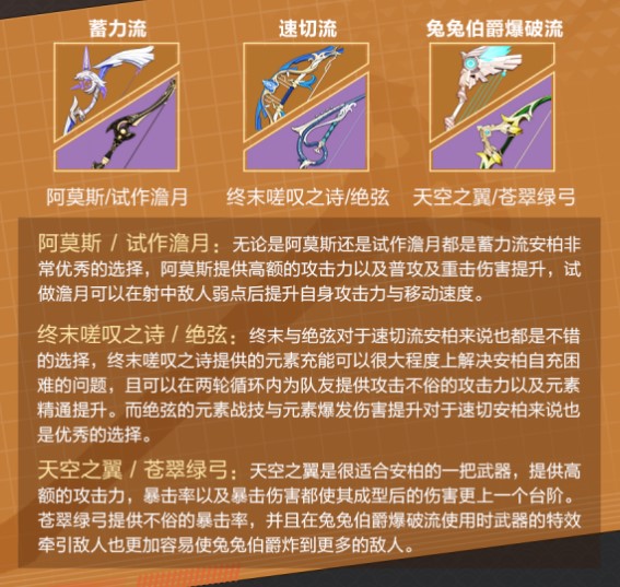 原神安柏武器用什么?安柏是一位能力多元化的角色,她有多种不同的培养方向可供选择,每一种培养方向都有着其独特的圣遗物、武器配置以及所需的命座。在各个方向之间,安柏的玩法和风格都有所不同,这让她在玩家手中