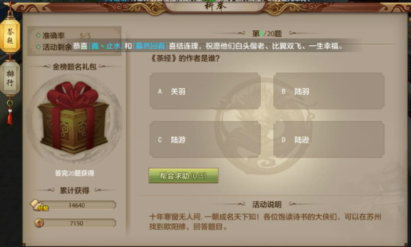 科举考试是游戏日常活动中的一大玩法,每天只可以参加一次,每答对一题就可获得经验及铜币奖励,答对的题数越多,获得的奖励越丰厚,全部答对的话可以获得一个金榜题名大礼包,但是很多玩家不知道有些问题的答案是什么,下面我为小伙伴们整理了天龙八部手游科举乡试题目答案汇总!按住CTRL+F,可以快速查找你想要知道的问题答案哦~天龙八部手游科举乡试题目答案