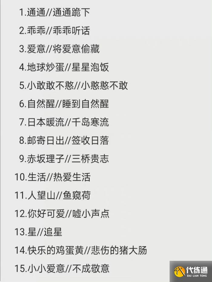 分享一些有意思的情侣ID,王者的CP们一如既往的大脑洞啊。不过这些情侣ID里,也有一些奇奇怪怪的ID!!例如那个“落”和“日落”,起初没整明白,反应过来后就一个想法,这么直接的嘛?可爱版:1、我猫呢 ‖ 喵呜2、大魔王 ‖ 小垃圾3、骗子说 ‖ 傻子听4、大猪蹄子 ‖ 泡椒凤爪5、半只烤鸭 ‖ 另外半只6、复 数 ‖ 单 数7、鹿由器 ‖ 吴线网8、猫九命