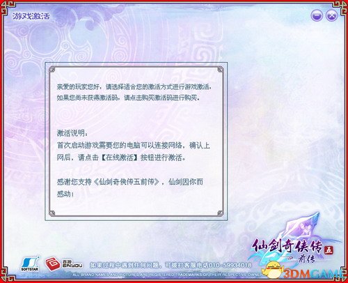 1、获得仙剑奇侠传五前传激活码您可以通过购买数字版激活码以及实体版(标准版、豪华版)内激活卡来获得仙剑奇侠传五前传游戏激活码数字版激活码可以通过官网仙剑商城、官网淘宝以及合作网站进行购买仙剑商城:http: shop.baiyou100.com 实体版(标准版、豪华版)包装内含仙剑奇侠传五游戏激活卡一张,您可以刮开激活卡上涂层部分查看您的激活码。2、激活规
