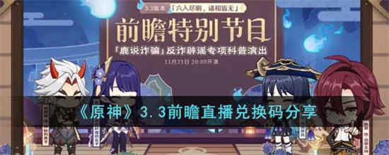 原神3.3前瞻直播兑换码是什么?大家都知道这是一款非常有趣好玩的冒险手游,大家在游戏中化身为一位旅行家,并且在旅行途中,展开无尽的探险。游戏中还有很多的精彩游戏内容在等待各位玩家前往挑战,玩家们完成相关的