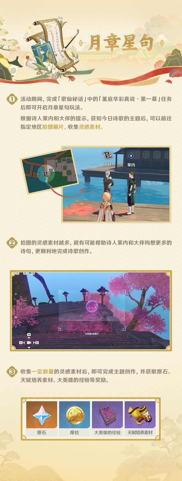 原神月章星句活动怎么玩?月章星句活动是原神2.6版本以来继拍照活动——画外旅照之后的第二个活动,是大活动光华容彩祭祭典的「堇庭华彩」中的一个小活动,和其他活动一样,是一个小游戏,附带了原石,摩拉经验还有一些