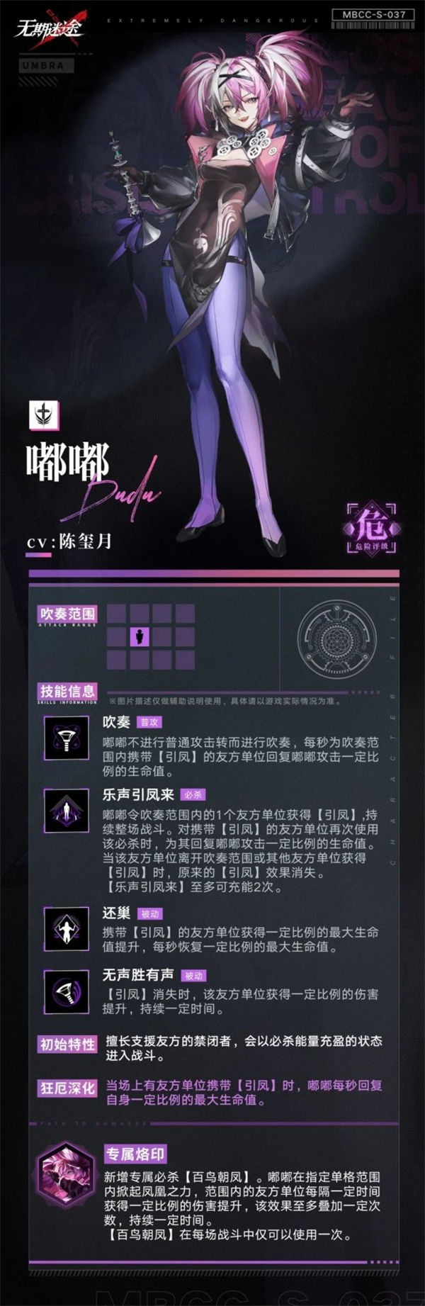 无期迷途作为一款策略塔防手游,游戏中的表现非常不错,选择了少见的犯罪题材的原因,将人物角色的个性打造了起来,让玩家们非常有代入感。嘟嘟是即将上线的全新禁闭者,属性为启迪,后续随着玩家的探索将了解这个新