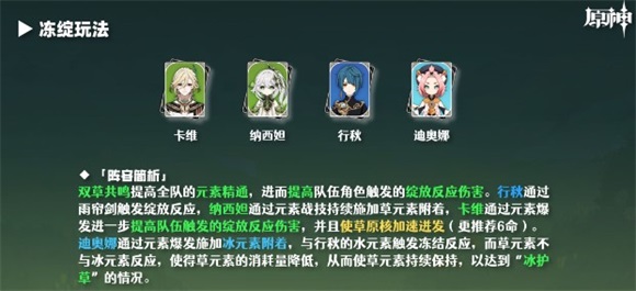 原神卡维冻绽玩法怎么玩?卡维的冻绽配队是一个由卡维、纳西妲、行秋和迪奥娜组成的阵容。这个阵容的双草共鸣能够有效地提高全队的元素精通能力,从而增加队伍角色触发的绽放反应伤害。行秋的雨帘剑是触发绽放反应的