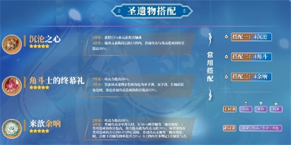 原神神里绫人的圣遗物怎么搭配?目前适合绫人的圣遗物套装有三种,分别是4沉沦、4角斗以及4余响。这三种圣遗物套装在最终收益下不分伯仲,更建议的是有哪套优先成型或者哪套副词条好就用哪套即可。这三套圣遗物共同点